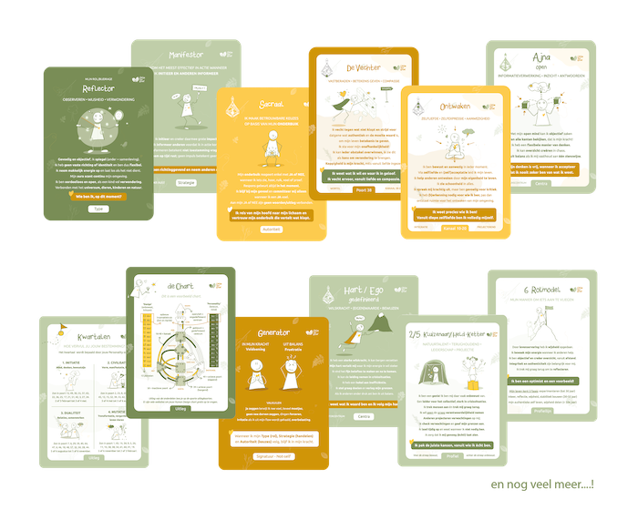 De grote hoeveelheid informatie vanuit mijn Design, word mij door deze kaarten veel duidelijker. Doordat elke kaart een heldere omschrijving, thema/categorie, boodschap en affirmatie heeft. De illustraties zijn daarbij superleuk en van toegevoegde waarde. De kaarten bieden helderheid en inzicht en vormen een duidelijke roadmap van mijn Design en levenspad. Ermee ‘werken’ stimuleert me om mezelf te blijven onderzoeken en nodigt me uit om verder te ont-wikkelen.